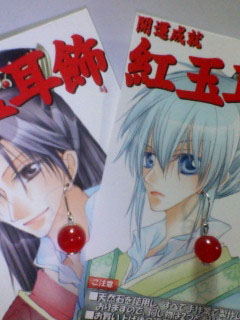 こちらは紅い石のついた耳飾と、イラストカードのセットとなります。耳飾は、フック式のピアスタイプとなっております。