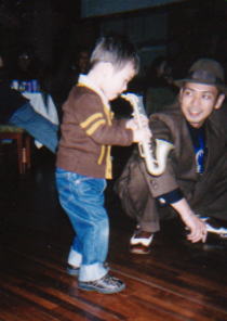 リンダちゃんのバンドのラッパ隊の前で かわいいサックス君将来有望ですね、 間違ってもソ○ルMみたいになるなよ〜!(笑)  |