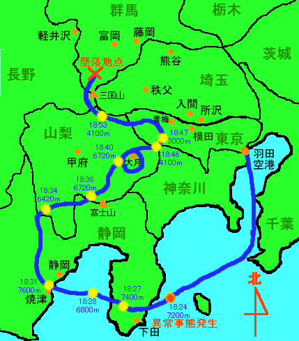 自衛隊空幕が運輸省運用課へ”千葉県嶺岡山のレーダーから消えた位置は北緯36度2分、東経138度41分”と連絡する。