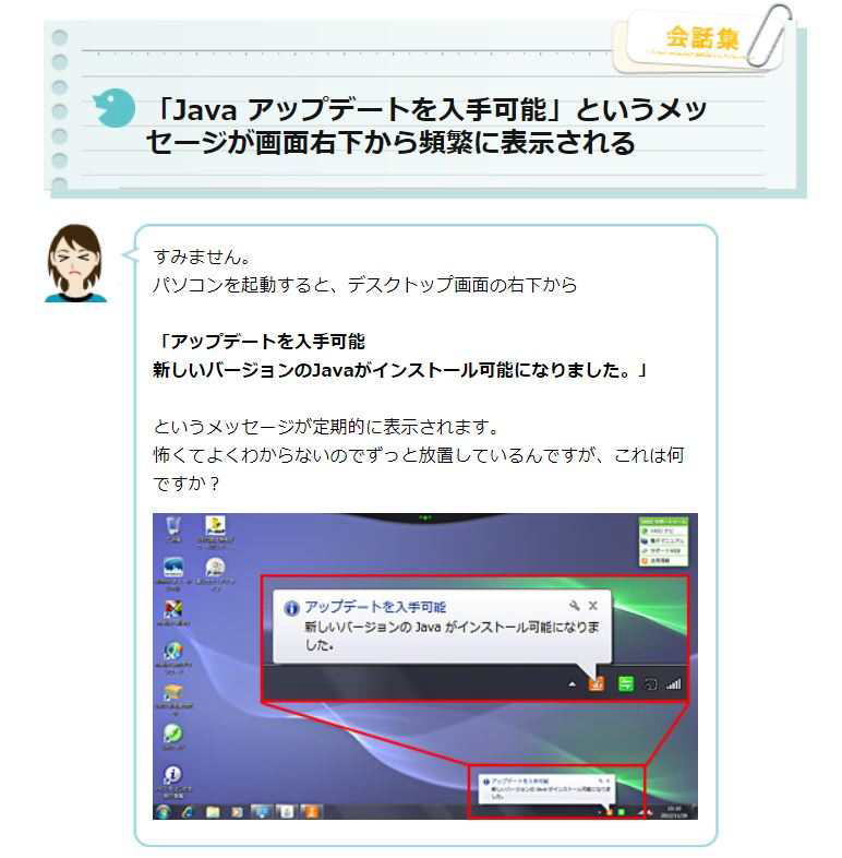 パソコン使用中に突然表示されるメッセージの対処法 「どうしたらいいの?」にお答えします! (その1) [Javaアップデートを入手可能]というメッセージが 画面右下から頻繁に表示される場合 |