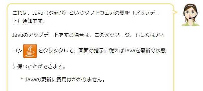 | *Javaアップデートを入手可能というメッセージ(連絡)は更新通知です。 [×]ボタンをクリックしてメッセージを消してもそのメッセージは定期的にまた表示されます。 パソコンに必要でかつ安全なソフトです。 確実に更新してください。 *Java(ジャバ)とは何をするソフトですか? ホームページの写真を動かすスライドショーやゲームやYouTube等の動画を見るための ソフトです。 Javaは入っていないパソコンもあります。Javaが入っていないパソコンではスライドショーや YouTubeは見れません。 *入っていないパソコンにJava(ジャバ)はあとからでも入れられますか? はい、無料で入れられます。 *Java(ジャバ)をアップロード(更新)しないと、どうなりますか? Javaを使用したホームページが正常表示されなくなります。そればかりか ソフトの脆弱性やソフトの欠陥の穴から、そのパソコンにウィルスが入り易くなり 危険性が高くなります。 |