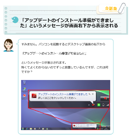 パソコン使用中に突然表示されるメッセージの対処法 「どうしたらいいの?」にお答えします! (その2) ![]() (アップデートのインストール準備ができました) というメッセージが画面右下から表示される場合 |