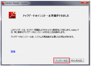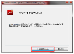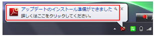 | 上の画面はAdobe Reader(アドビ・リーダー)のアップデート(更新)が 提供されていることをお知らせするものです。 アップデートをする場合は、このメッセージをクリックして画面の指示に 従えばAdobe Readerを最新の状態に保つことができます。 *Adobe Readerの更新に費用はかかりません。 |