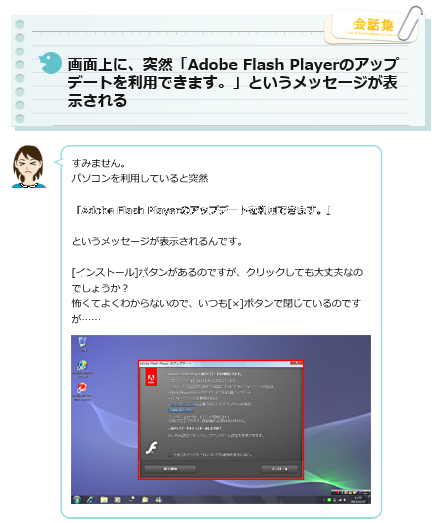パソコン使用中に突然表示されるメッセージの対処法 「どうしたらいいの?」にお答えします! (その3) ![]() Adobe Flash Playerのアップデートを利用できます のメッセージが画面上に突然表示された場合 |