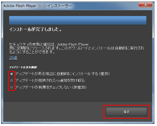 | アップデートの方法 1.使用許諾条件に同意しましたの□の中でクリックし 次に[インストール]ボタンをクリックします ![]() 2.しばらくすると下図が現れるので ◎アップデートがある場合に自動的にインストールする(推奨)を クリックして、最後[完了]ボタンをクリックで完了です。 ![]() |