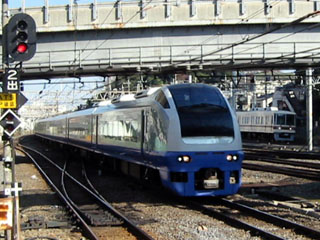 黄色は始発の上野駅でじっくり鑑賞しました。特急券がないとホームに入れないのが残念。 (2002/12@上野駅) |