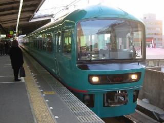 お座敷列車の「やまなみ」に会いました。タタミが敷いている電車と、宴会で盛り上がる おじさん、おばさんたちに優斗はびっくり仰天。(2002/2@西船橋駅) |