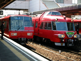 右は名鉄といえばこの電車!のパノラマカー7000系です。 名調子の「パノラマホーン」を鳴らしながら今日も快走しています。 二階運転台、前面展望車、連続窓など、画期的なデザインのこの車両、 なんと1961年登場と言うから驚きです。21世紀にも大活躍している見事な設計です!! 左は5700系。この車両も前面窓が大きいな。名鉄は前面展望のサービスが徹底してます。 (2003/3@大江駅) |