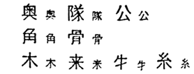 - この表の字体は,活字字体のもとになる形であるから,これを,みんちょう体,ゴシック体その他に適用するものとする。