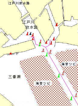 【プロフィール】 江戸川放水路河口の埋立地に作られた内航船企業波止場。 港口から三番瀬になり海苔シビが広がり江戸前景色を展開している。 航路沿は「江戸前はぜ、カレイ、白ギス」の好釣場で初秋は釣船で賑わう。 冬は、10月から3月頃の”腹太すずき”がルアーでヒットする。 河口の埋立港で航路を外れると極端に浅くなるから注意が必要。 【入港ガイド】 @船橋航路ブイNo5/6を西に曲がると市川航路ブイが前方に見える。 A西進すると両脇に「のりしび」が並んで航路を外れると急激に浅くなるので注意。 BNo7.8番ブイの北側に北岸壁に分かれる。 C直進すると南側岸壁に分かれる。 D港入口の黒円錐型の境界ブイ手前で急に浅瀬となる。 E黒ブイ手前を左折すると市川港南岸壁になるがヨットは接岸不可。 F南西奥にヨット泊地があるが係留場所は無く上陸できる場所もない。 G江戸川上流には河口堰があって溯上は出来ない。 【港ガイド】 @係留はアンカー係留となる。底質は砂と泥である。 A上陸地は一切無い。 B従って補給は一切出来ない。 【であい】 小さい頃からはぜ釣りにお世話になってます。 |
