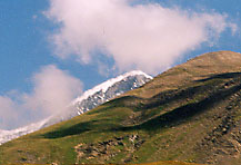 イタリア側に目をやると、下の写真のように、雪渓の向こうに、緑の