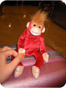 ウッキー モンキーとかたい握手をかわす。 ※ウッキーモンキーとは、ご覧の通りサルのぬいぐるみで、私の旅友だちです。 |