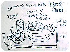 | ケアンズ空港からエアーズロックへさらに飛行機で3時間。ここでも美味しい機内食。 なんか、たくさんの種類のドライフルーツが入っているシリアルがメインだったんだけど、これが一口目あまりおいしくないと思ったのに、食べてるうちにめちゃくちゃハマる味!これはうまかったな。でも顎がつかれた。欧米人はあんな堅いもんばかり食べててアゴが発達してんのか?とか思った。我々も玄米を食わねばなるまいか? ドライフルーツが入っていたパンは私の苦手な味で全く受け付けなかった。 Teaと言っていたアテンダントにコーヒーをつがれ(聞き間違いじゃないよ!向こうが言い間違ったんだよ、絶対!!)、コーヒー飲めない私はシリアル用のミルクを1/3ほどコーヒー用にまわすはめに。(コーヒー牛乳みたいにすればなんとか飲めるかな・・・と思って。)ちなみにこのミルクの絵がビミョ〜なタッチの絵でかわいかった。安っぽいパッケージで。でもエアーズロックのスーパーでも普通に売ってる銘柄だった。