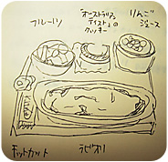 空の旅も5時間が経過。ちょっと小腹がすいちゃって・・・と思っていたらタイミングよく軽食がでてきた(笑)。すばらしい!…ところが軽食って量じゃなくってだいぶ残したけどね〜。。。ラビオリ、フルーツ、キットカット&クッキー。クッキーは帰りの高速バスで食べた〜。 |