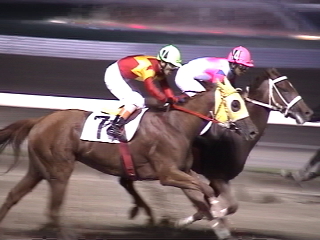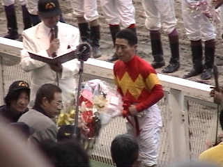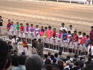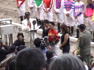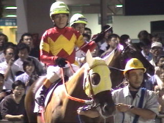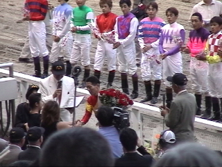 平成13年7月8日、川崎競馬場で、「鉄人・佐々木竹見騎手」の引退式が行われると聞き、川崎競馬場に行ってきました。この日は宇都宮競馬場でブライアンズロマン号の引退式を見た後、新幹線に飛び乗り引き返すという強行軍。正直、疲れましたね・・・・。なお、画像はビデオカメラの映像をキャプチャしたものですので、ちょっと画質が悪いです。